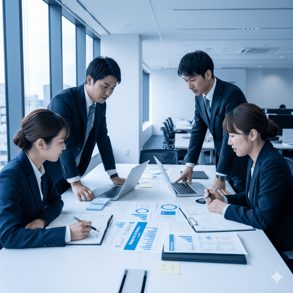 1. 現状把握の打ち合わせシーン(資料とデータに焦点)